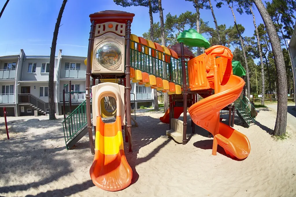 strefa Aquaparku (zadaszony/odkryty basen, trzy zjeżdżalnie, brodzik dla dzieci z podgrzewaną wodą z armatkami wodnymi, jacuzzi), dwie bawialnie dla dzieci w budynku głównym, sala zabaw, dwa place zabaw usytuowane na świeżym powietrzu, park siatkowy, boisko do siatkówki plażowej, miejsce do gry w koszykówkę, stoły do tenisa, cymbergaj, bar letni, amfiteatr z miejscem na grilla, sala dyskotekowa, minigolf (dodatkowo płatny, ze zniżką dla gości ośrodka).