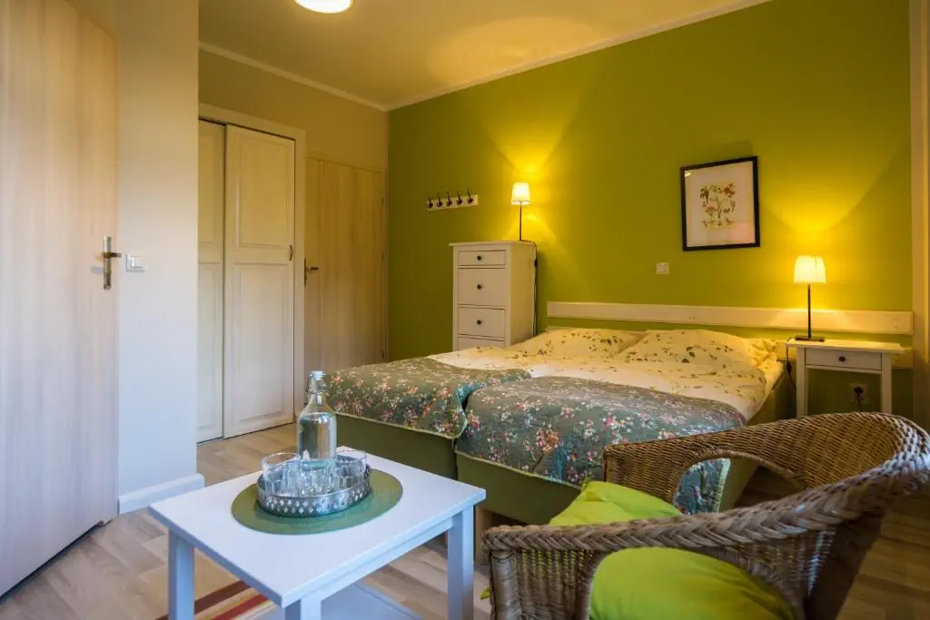 Pokoje: 2-osobowe ok. 13 m2 z łazienkami (prysznic, WC, umywalka, ręczniki) wyposażone w TV, szklanki, powitalną karafkę z wodą ze studni głębinowej oraz dostęp do bezprzewodowego Internetu - Wi-Fi.