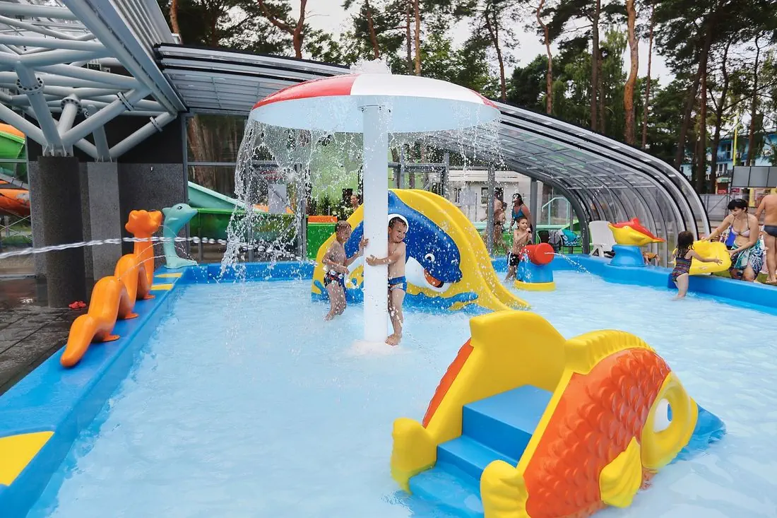 - STREFA AQUAPARKU z 3 zjeżdżalniami, jacuzzi oraz brodzikiem dla dzieci z armatkami wodnymi! moc ATRAKCJI DLA DZIECI - 2 place zabaw na świeżym powietrzu, 2 bawialnie, park siatkowy!